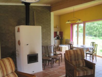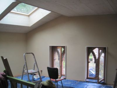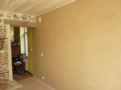 L’utilisation de la terre en enduit apporte à la pièce une ambiance chaleureuse, une régulation de l’humidité ambiante et, par son côté légèrement granuleux, un confort acoustique.
